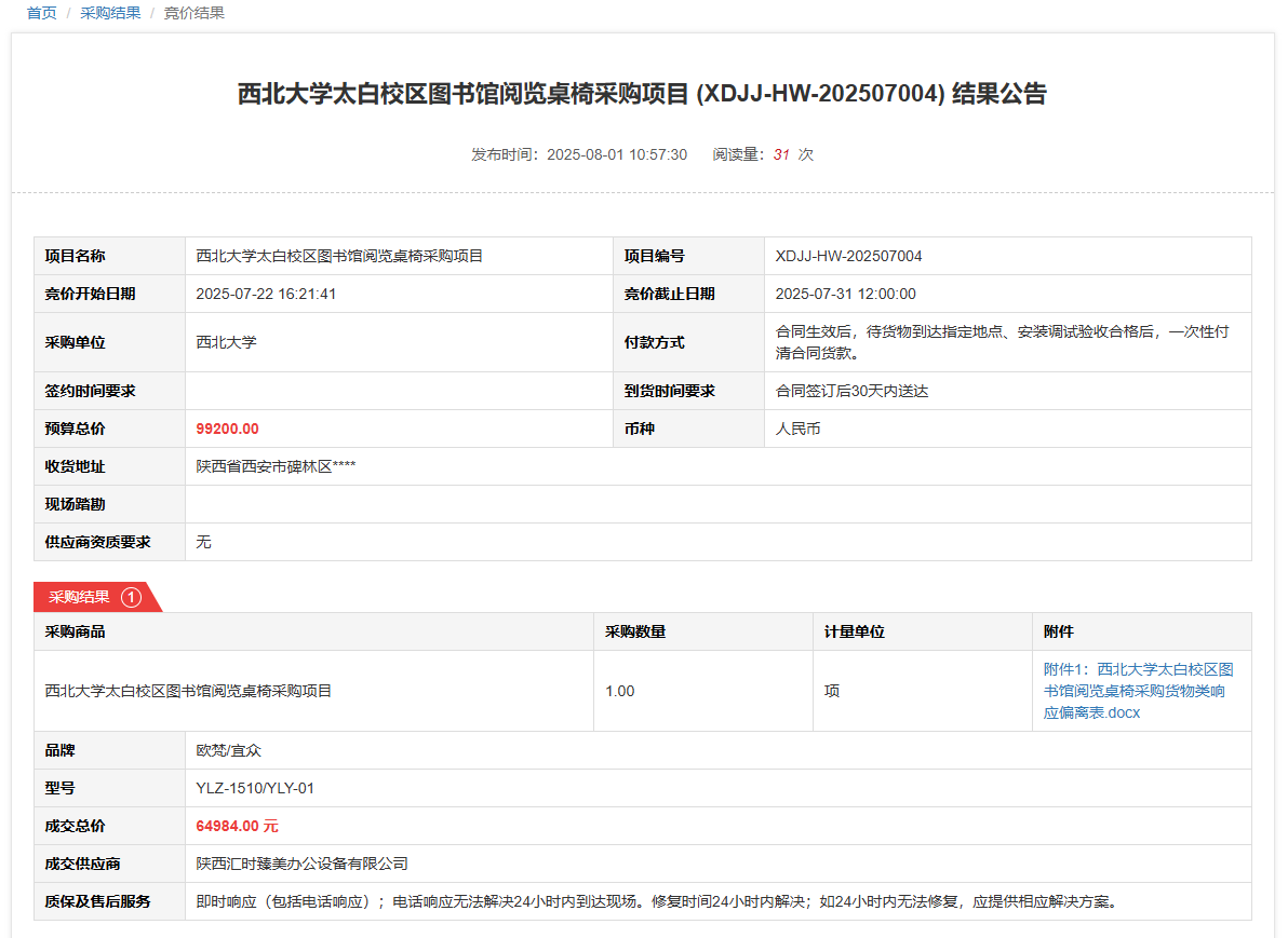 米兰买球太白校区图书馆阅览桌椅采购项目(XDJJ-HW-202507004)竞价结果公告