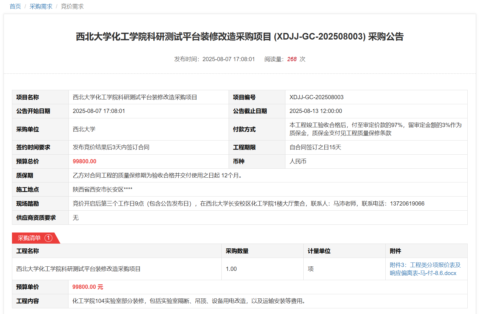 米兰买球化工学院科研测试平台装修改造采购项目(XDJJ-GC-202508003)竞价采购公告