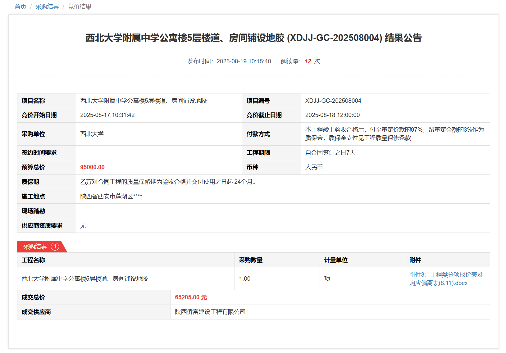 米兰买球附属中学公寓楼5层楼道、房间铺设地胶(XDJJ-GC-202508004)竞价结果公告