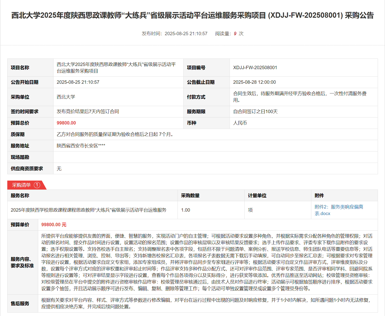 米兰买球2025年度陕西思政课教师“大练兵”省级展示活动平台运维服务采购项目(XDJJ-FW-202508001)竞价采购公告
