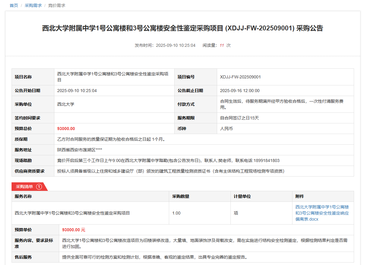 米兰买球附属中学1号公寓楼和3号公寓楼安全性鉴定采购项目(XDJJ-FW-202509001)竞价采购公告