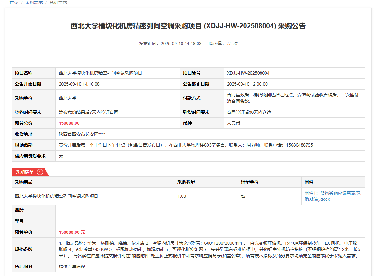 米兰买球模块化机房精密列间空调采购项目(XDJJ-HW-202508004)竞价采购公告