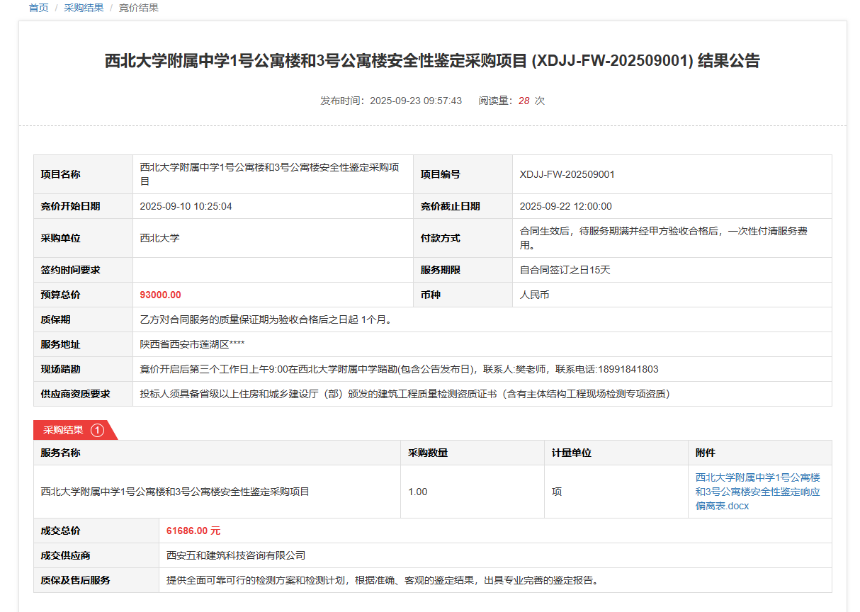 米兰买球附属中学1号公寓楼和3号公寓楼安全性鉴定采购项目(XDJJ-FW-202509001)竞价结果公告