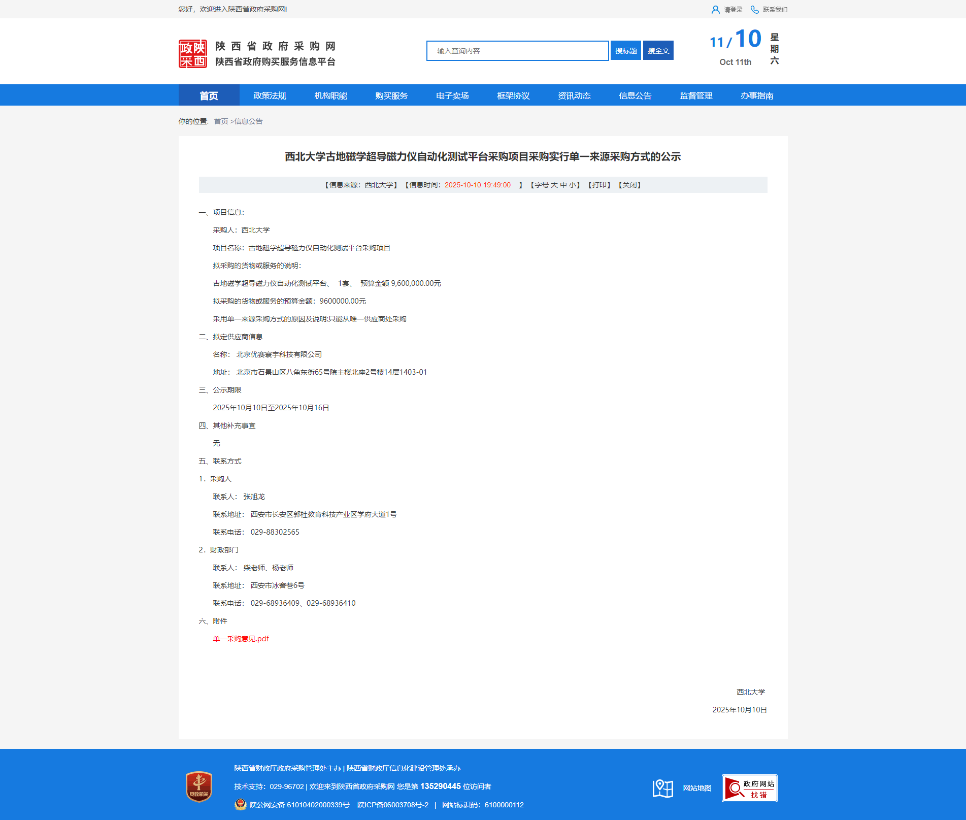 米兰买球古地磁学超导磁力仪自动化测试平台采购项目采购实行单一来源采购方式的公示