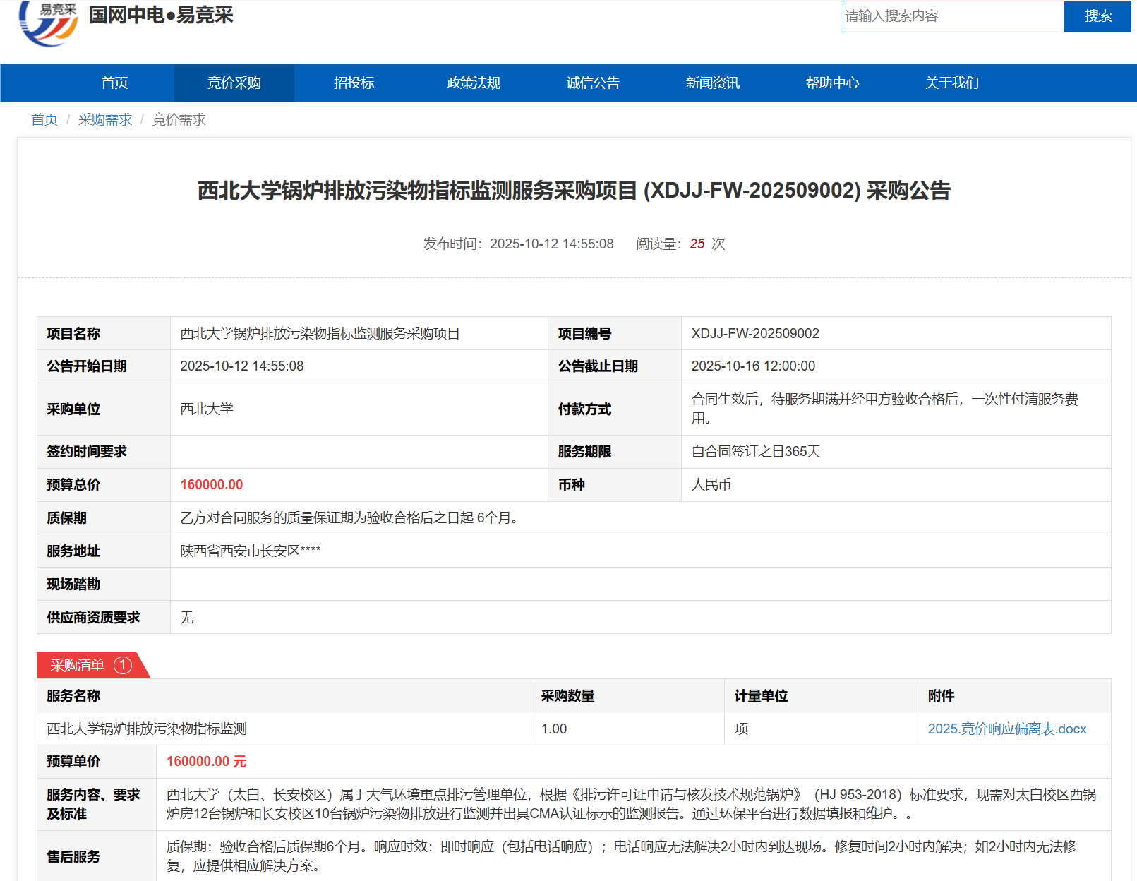 米兰买球锅炉排放污染物指标监测服务采购项目(XDJJ-FW-202509002)竞价采购公告