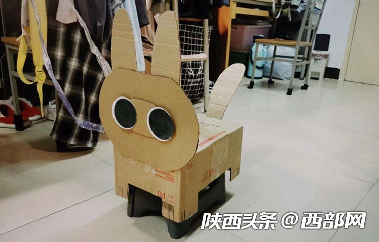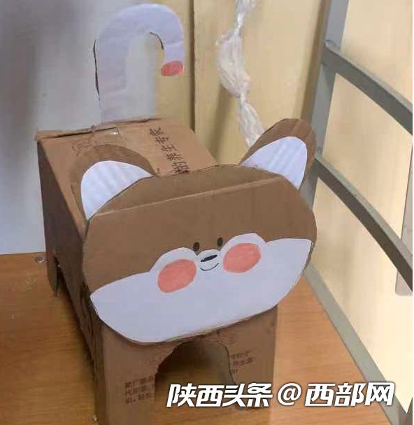 龚同学介绍,花卷是一只用废弃的牛奶盒做成的狗,它不仅有名字,还有狗牌号。“狗牌号就是我们的宿舍号,我们准备带它出去遛遛,但是它的头好像粘得不是很牢。”龚同学说,这样的活动不仅丰富了课余生活,也带来了心灵的慰藉,大家用的都是废旧的纸箱子,也算是废物利用了。