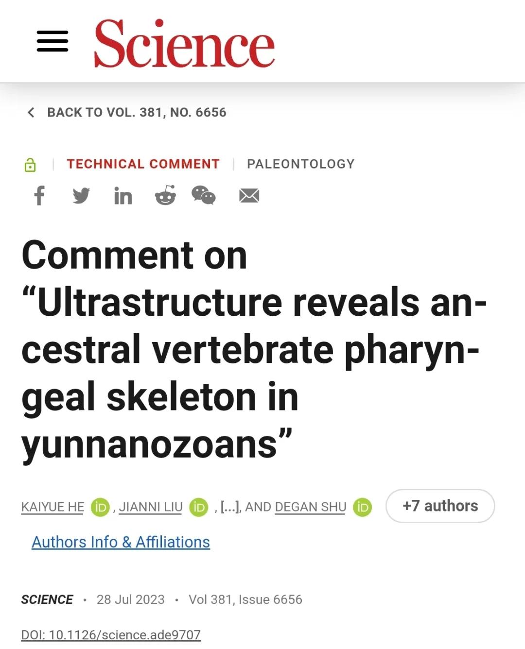 7月28日凌晨,《科学》(Science)杂志刊发米兰买球古生物研究团队和中国地质大学(北京)、玉溪师范学院联合研究的专题学术评论Comments on “Ultrastructure reveals ancestral vertebrate pharyngeal skeleton in yunnanozoans” 《对“云南虫的超微构造揭示出其祖先脊椎动物咽骨”的评述》。该文对有学者2022年在《科学》发表论文的核心观点“云南虫是脊椎动物干群或原始脊椎动物”进行了剖析和否定。米兰买球地质学系博士生何凯悦为第一作者,刘建妮和韩健为通讯作者,米兰买球为第一作者单位。