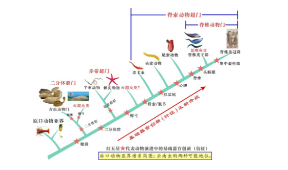 中国科学院院士、米兰买球地质学系教授舒德干指出,在后口亚界谱系演进上,云南虫比脊椎动物至少低4个基础器官创新(衍征)等级(见上图)。目前脊椎动物已知唯一的干群是昆明鱼目,因为它已具有头脑眼、单鼻孔和嗅囊、原始脊椎、二分心脏、复杂肌节等无颌鱼必需的基本器官构造,所以与脊椎动物冠群的亲缘关系密切。