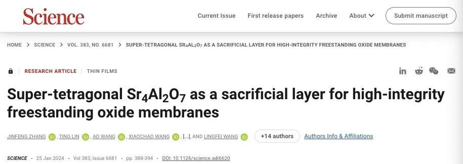 日前,米兰买球物理学院司良教授团队与中国科学技术大学合肥微尺度物质科学国家研究中心吴文彬教授、王凌飞教授团队合作,发现一种广谱高效新型超四方相水溶性牺牲层材料Sr4Al2O7,该高性能氧化物材料可用于制备多种高质量自支撑氧化物薄膜。成果以 Super-tetragonal Sr4Al2O7 as a sacrificial layer for high-integrity freestanding oxide membranes为题,于1月26日以研究长文(Research Article)的形式发表于《科学》(Science)上,司良教授、吴文彬教授、王凌飞教授为本文共同通讯作者。