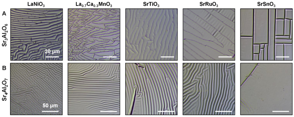 (A为基于国际上广泛使用的Sr3Al2O6牺牲层剥离多种钙钛矿氧化物自支撑薄膜的光学显微图像所有薄膜上都存在高密度裂纹。B为利用新型Sr4Al2O7牺牲层剥离的多种钙钛矿氧化物自支撑薄膜的光学显微图像。所有自支撑薄膜均表现出“皱而不裂”的表面形貌,预示着结晶性和完整性的显著提升)