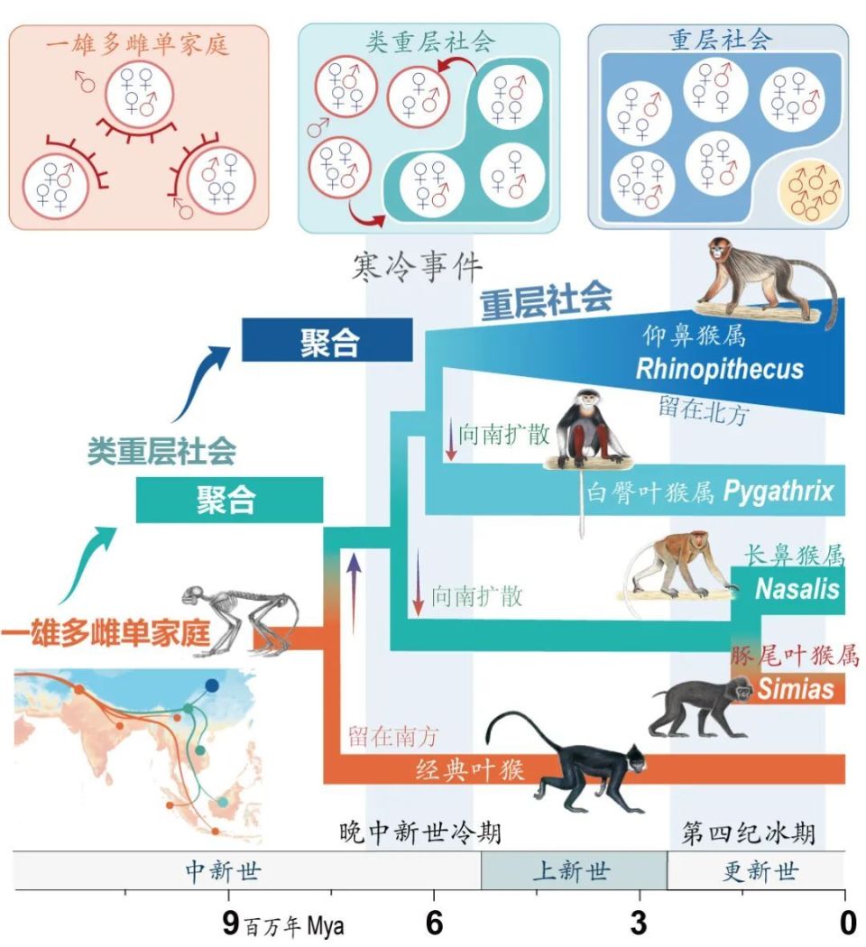 米兰买球齐晓光教授团队联合国内外多家科研单位,通过整合生态学、地质学、行为学、进化基因组学等多学科,通过系统发育分析和社会系统的祖先状态重建,发现亚洲叶猴中奇鼻猴类群的社会系统演化经历了两步式的聚合过程,且两次聚合都与冰期时期相关。在此过程中,与寒冷适应和神经激素相关的基因在奇鼻猴类群中发声变化,这些基因在社会联系中起着关键作用。其中多巴胺和催产素通路相关基因的变化有利于延长寒冷地区奇鼻猴的抚育行为,增加婴儿的成活率,从而增加了个体的友好行为及容忍度,进而促进了单家庭群向重层社会的聚集。