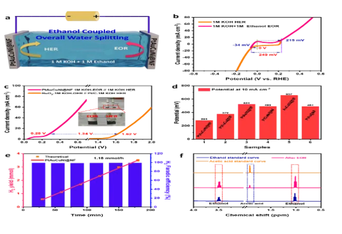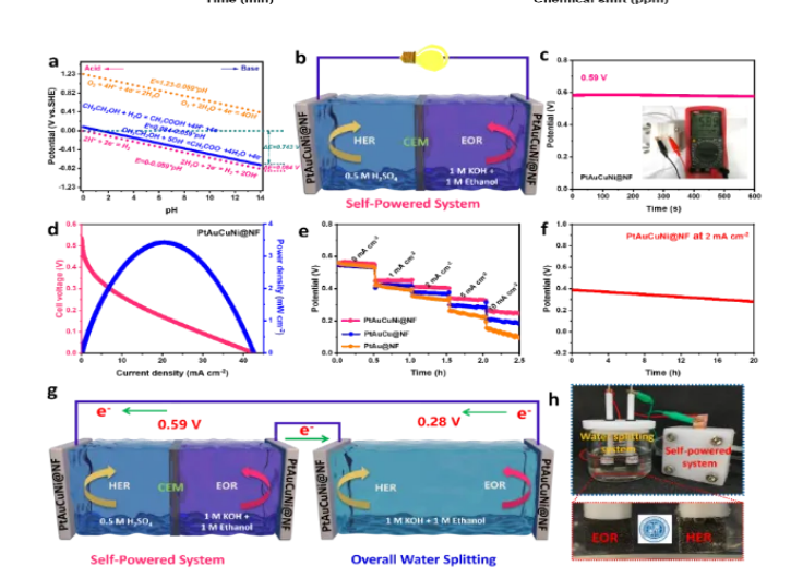 米兰买球化材学院科研团队制备了一种新型四元合金催化剂(PtAuCuNi@NF),在乙醇氧化反应(0.215V,10mA cm-2)和析氢反应(HER)(7mV,10mA cm-2)中表现出优异的活性。实验结果表明,铜和镍调节了铂和金周围的电子环境。富含电子的活性中心促进了EOR和HER反应物和中间产物的快速吸附和解离。在乙醇辅助整体水分离(E-OWS)中,0.28 V 电压下的电流密度达到了10mA cm-2;此外,还组装了一个先进的,其自供电电压可达 0.59 V。因此,通过将酸碱自供电系统(A-Bsps)与E-OWS设备集成,实现了零外部电源的自驱动制氢。