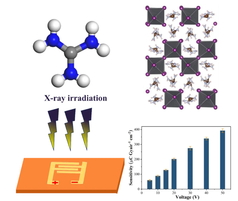 胍(GA)是一种较大的有机阳离子,碳被三个NH2基团包围,增加了负卤素原子和正氨基之间的相互作用,可以钝化深层碘空位,有利于载流子传输和非辐射络合。GA具有近似于D3h的高对称性且偶极矩几乎为零,可提供六个潜在氢键,作为二维钙钛矿的有机层时,可以强化与无机金属骨架间的内聚力。米兰买球物理学院科研团队通过降温结晶合成了带隙为2.28 eV的大尺寸二维钙钛矿GA2PbI4单晶,该单晶具有高的µτ积(7.5×10-4 cm2 V-1),低的陷阱密度(6.44 × 108 cm-3),GA2PbI4单晶X射线探测器具有优异的灵敏度( 392.4 μC Gyair-1 cm-2)和X 射线工作稳定性。