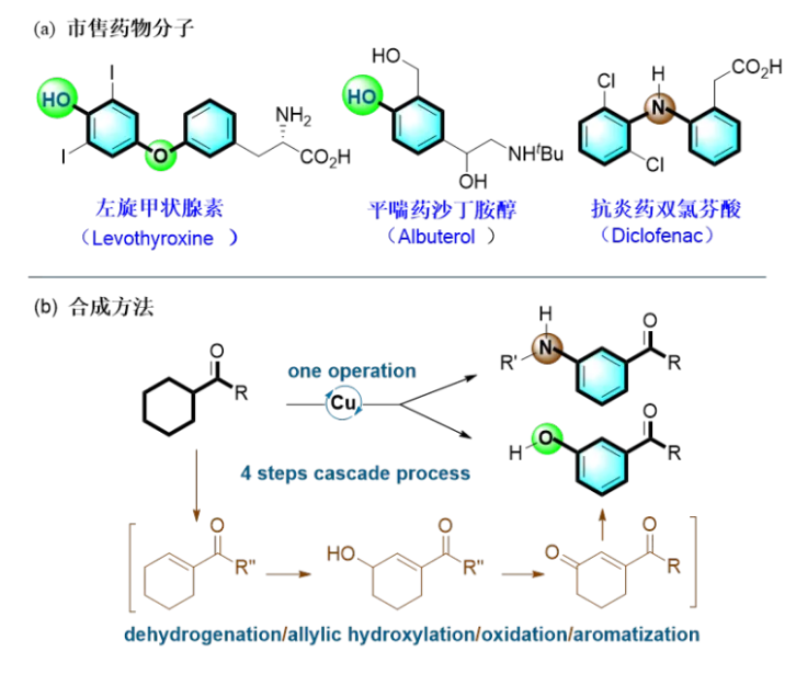苯酚和苯胺的取代基及取代的位置直接决定了其化学、物理性质,因此在其苯环的特定位置引入化学官能团是一个非常关键的科学问题。由于羟基和氨基强的给电子能力及对应的邻、对位定位效应,通过芳香亲电取代反应原则上主要得到邻位和对位取代的产物,而间位取代的产物很难得到。米兰买球化材学院科研团队利用铜催化的脱氢氧化串联策略,实现了间位羰基的苯酚和苯胺选择性合成。由于羰基处于有机合成的枢纽,通过其进一步转化,可以合成各种分子单元。本方法为间位取代酚类和苯胺提供了一种通用的合成路径。