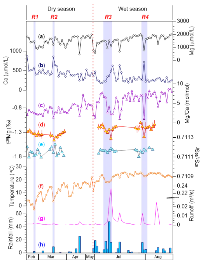 米兰买球地质学系科研团队通过对黄土高原小流域河水开展高分辨率δ26Mg研究,发现雨季相对旱季δ26Mg偏高,而雨季发生降水时δ26Mg降低。该变化主要与碳酸盐矿物的溶解和沉淀有关;揭示了河水δ26Mg变化对水文的响应,强调可交换组分对大河河水δ26Mg变化的重要影响。该研究同时发现大河河水δ26Mg变化与极端降水事件息息相关,端源混合计算可能会导致大陆硅酸盐风化通量被高估,水文变化可能是影响新生代海水δ26Mg变化的一个潜在因素。