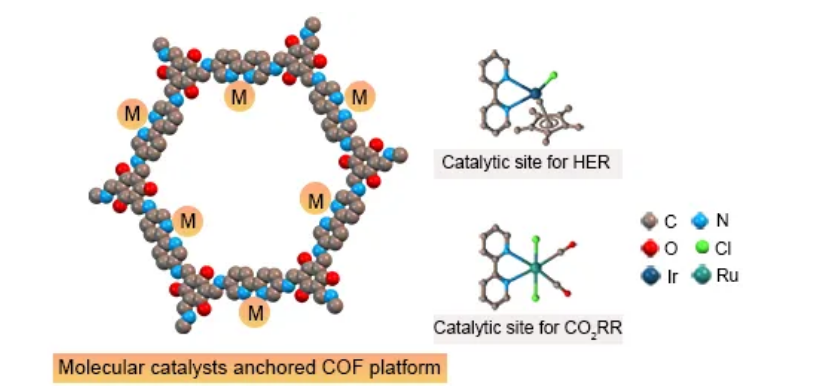 在COFs结构中构建分子催化单元,不仅能赋予COFs特定的催化活性,也能提高分子催化剂的稳定性与可循环利用性。米兰买球化材学院科研团队以包含丰富的联吡啶单元的COF材料TpBpy为载体,通过后修饰的方法,分别将具有催化质子还原产氢功能的[Cp*Ir(Bpy)Cl]和催化CO2还原功能的[Ru(Bpy)(CO)2Cl2]锚定到TpBpy的结构中。以[Ru(Bpy)3]Cl2作为光敏剂,以所制备的TpBpy-Ir和TpBpy-Ru为催化剂,分别实现了光催化产氢与CO2还原。
