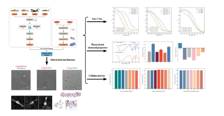 米兰买球食品学院科研团队针对水产胶原蛋白热稳定性差的问题,提取了四种不同鱼皮来源的胶原蛋白,并通过引入斑马鱼和人类的热休克蛋白47(Hsp47)实现其三螺旋结构的稳定。Hsp47与鱼皮胶原的非共价组装作用,显著提高了胶原蛋白的折叠效率,并使其变性温度大幅提升至37.7℃。这一创新成果不仅为水产胶原蛋白的改性提供了新思路,从而拓宽水产胶原蛋白在医药、食品加工等领域的应用,也为水产加工产业的可持续发展注入了新动力。