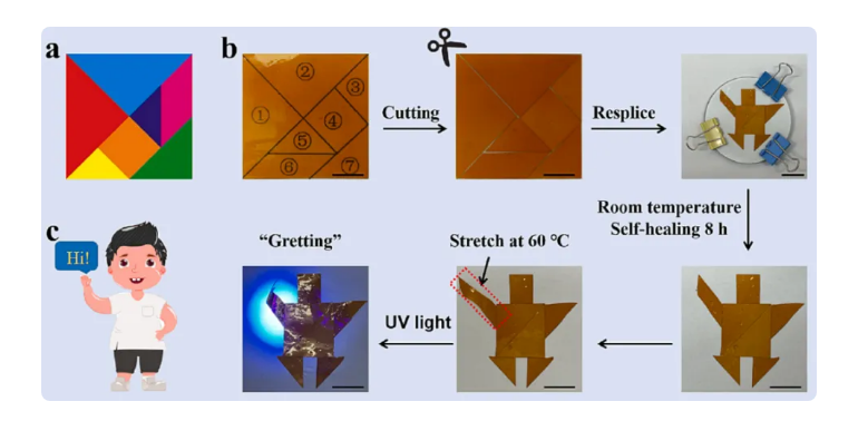 米兰买球化材学院科研团队在烯烃羰基化反应研究基础上,成功合成了一种集多功能为一体的高分子智能材料TASNP30。该材料不仅表现出优异的热致变色(黄→红)和湿度驱动(△RH低至30%,可对人体手掌湿度做出响应)功能,而且具有优秀的形状记忆和自愈合性能(60oC修复率>95%)。该材料可用于仿生伪装、湿度传感、信息加密等领域。