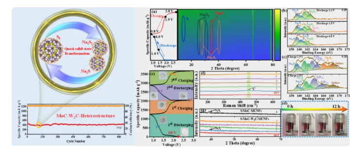 米兰买球化材学院科研团队通过构建MoC-W2C异质结构高效地促进可溶性多硫化钠(NaPSs)的转化,从而抑制NaPSs穿梭效应,实现NaPSs的准固态转化;同时利用多孔道碳纳米纤维有效地缓解充放电过程中S体积膨胀现象。该复合材料在室温钠硫电池中表现出低于目前文献报道的容量衰减率(0.018%)。