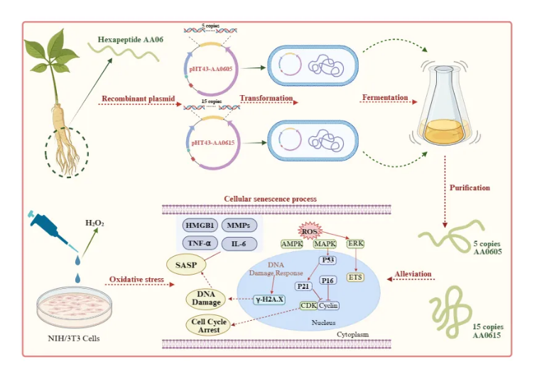 米兰买球化工学院科研团队通过基因重组技术以摇瓶发酵及纯化方式合成了人参肽的两种多拷贝体,并证明了这两种多拷贝体能够有效延缓氧化应激造成的细胞早衰。这项研究为小分子活性人参肽的工业化生产提供了基础,并且为合成小分子多肽提供了新的方向。