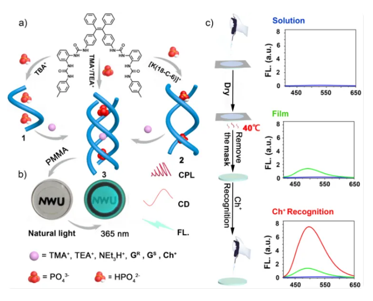 离散超分子结构的功能薄膜材料在传感、储能、催化等研究领域具有潜在的应用前景。米兰买球化材学院科研团队以阴离子配位组装体为基础,结合聚甲基丙烯酸甲酯(PMMA)合成了具有荧光、CD和CPL性质的功能薄膜。通过该策略合成的包含阴离子配位三股螺旋结构的薄膜,克服了阴离子配位自组装体在水中溶解度和稳定性差的问题,实现了水相生物分子(胆碱及胆碱衍生物)的识别,为设计和合成用于水相检测生物分子的功能材料提供了一种简单且通用的方法。