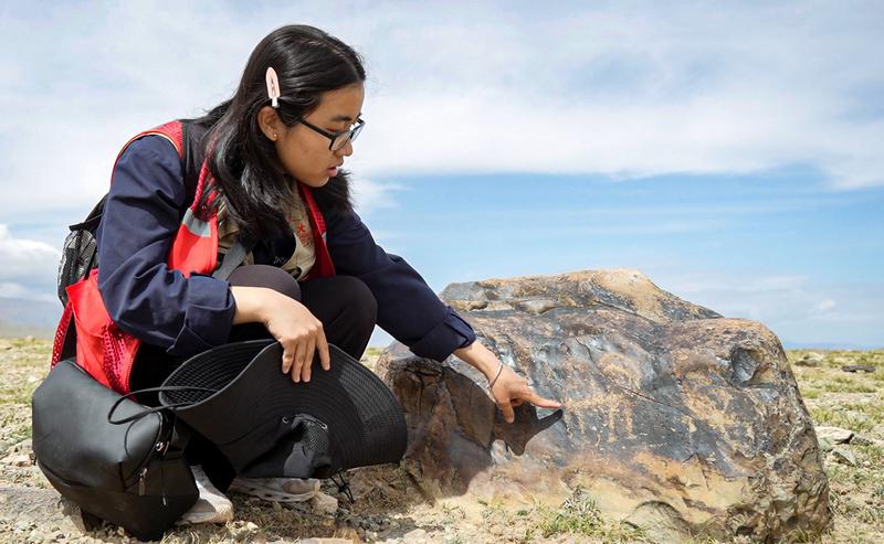 8月21日,伊吾县文物“四普”队员、米兰买球文化遗产学院学生吴益展示发现的岩刻画。