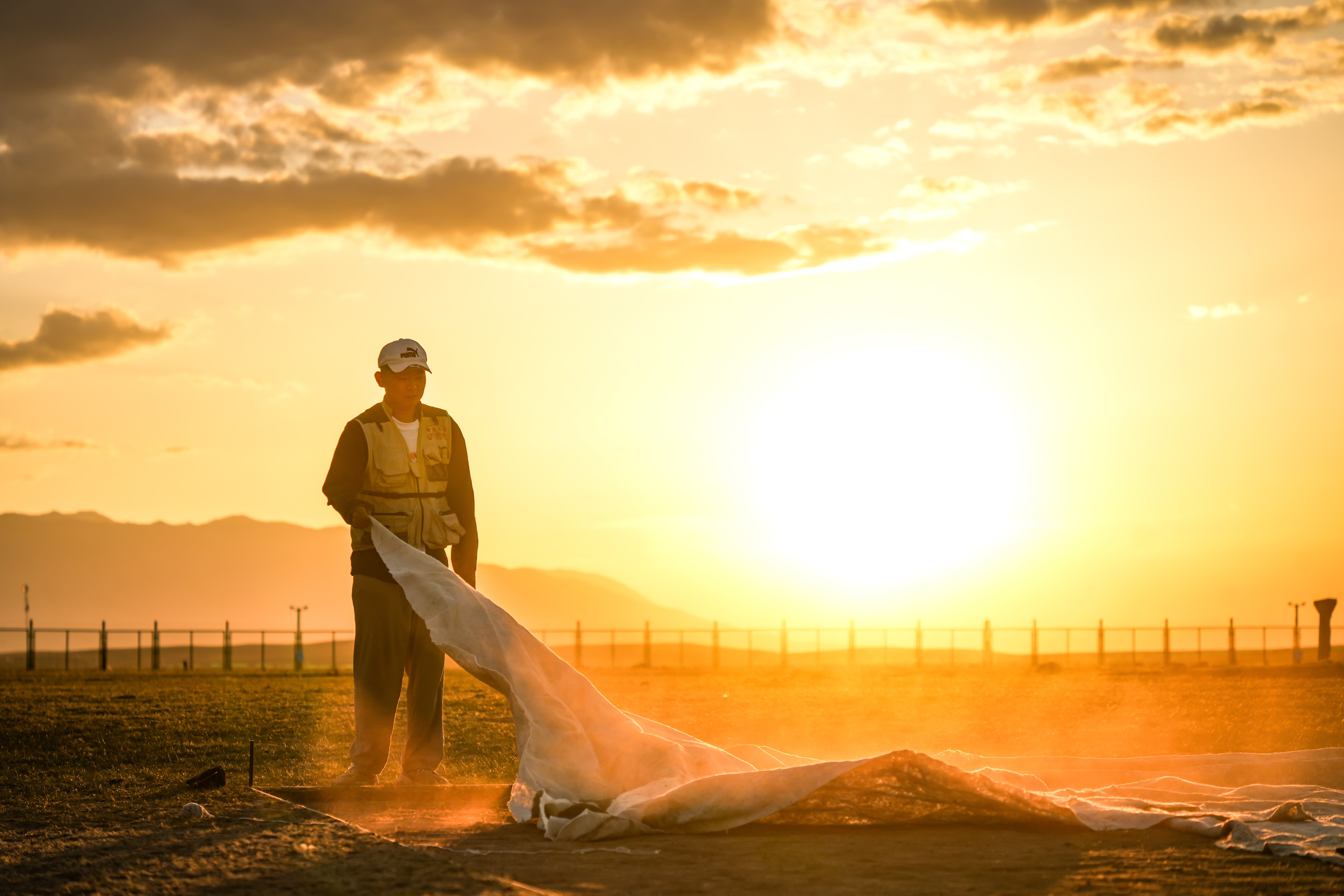 8月22日傍晚,伊吾县前山乡考古发掘现场,留下守夜的考古队队员封嘉乐将被风吹乱的探方保护布重新盖好。