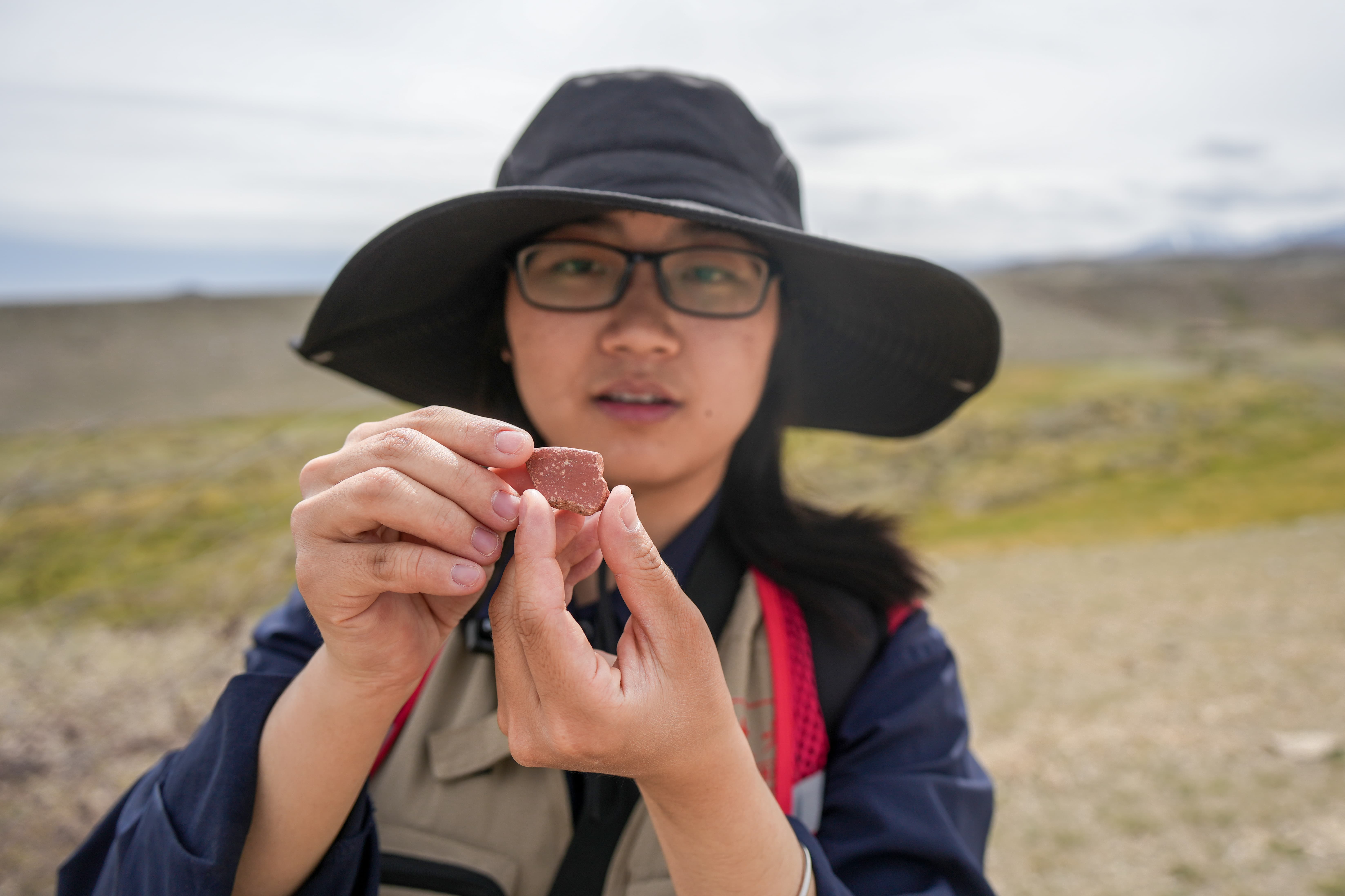 8月21日,伊吾县文物“四普”队员、米兰买球文化遗产学院学生吴益展示发现的古代陶片。