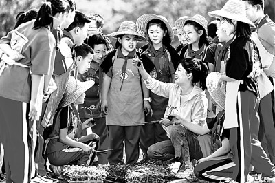 内蒙古呼和浩特市玉泉区百什户小学老师在“校园农场”指导学生栽种西红柿苗。丁根厚摄/光明图片