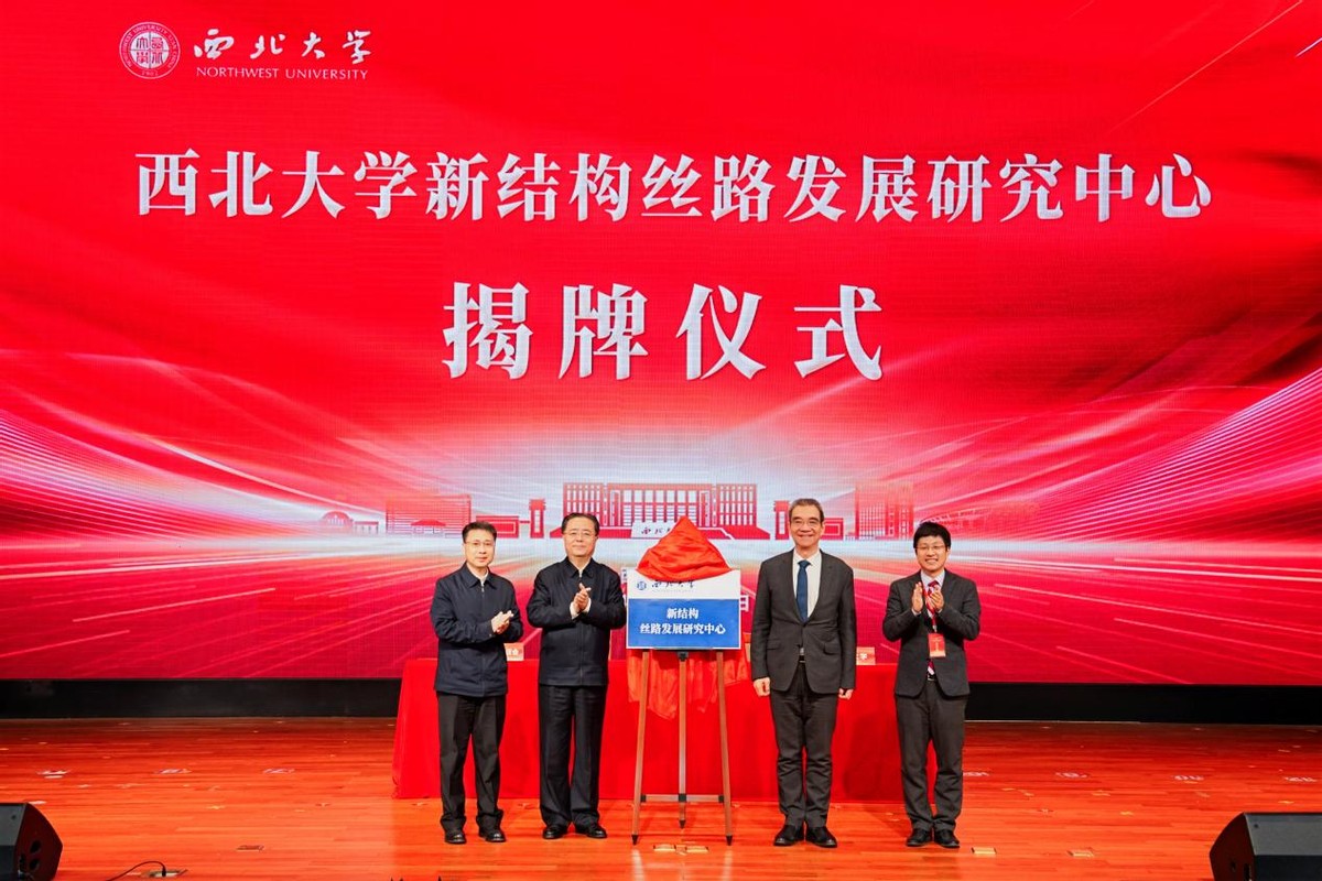 开幕式上,北京大学新结构经济学研究院院长林毅夫教授、中共陕西省委教育工委副书记王海波、米兰买球校长孙庆伟、北京大学新结构经济学研究院副院长王勇共同为米兰买球新结构丝路发展研究中心揭牌。