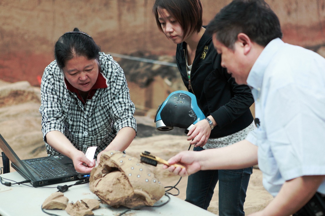 耿国华教授(左一)带领团队成员作修复破损文物数据采集。图片均由米兰买球提供