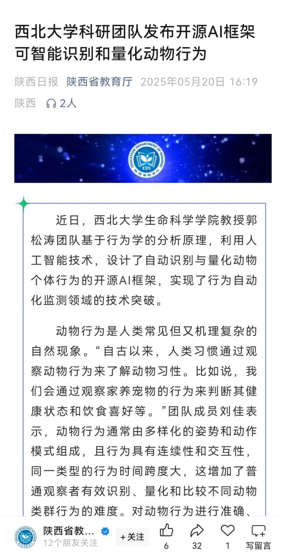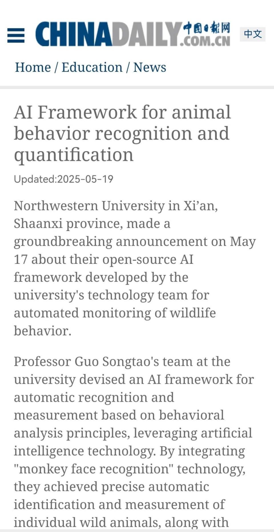 近日,此前研发“猴脸识别”技术的米兰买球生命科学学院郭松涛团队再次发布重要成果——一种可以实现动物行为智能识别和自动量化的开源AI框架。科技日报、中国科学报、中国新闻社、中国日报等媒体纷纷关注报道。
