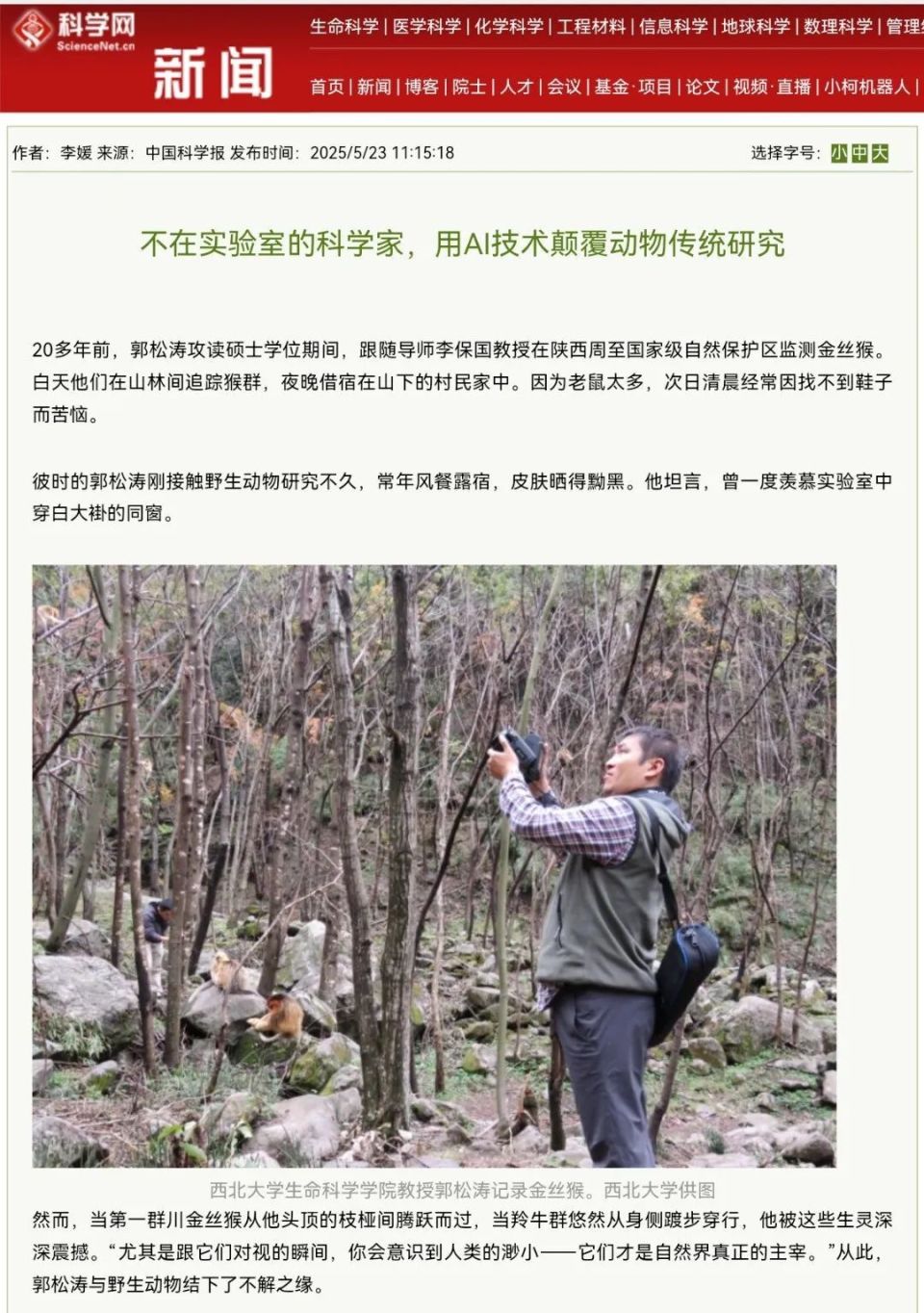 2018年,郭松涛联合米兰买球信息科学与技术学院,和西安电子科技大学跨学科攻关,开始研发专注于动物行为研究的人工智能技术;2020年,团队基于长期积累的金丝猴特征数据,创新性提出具有关注机制的深度神经网络模型,成功研发出全球首个金丝猴个体识别系统(Tri-AI)。