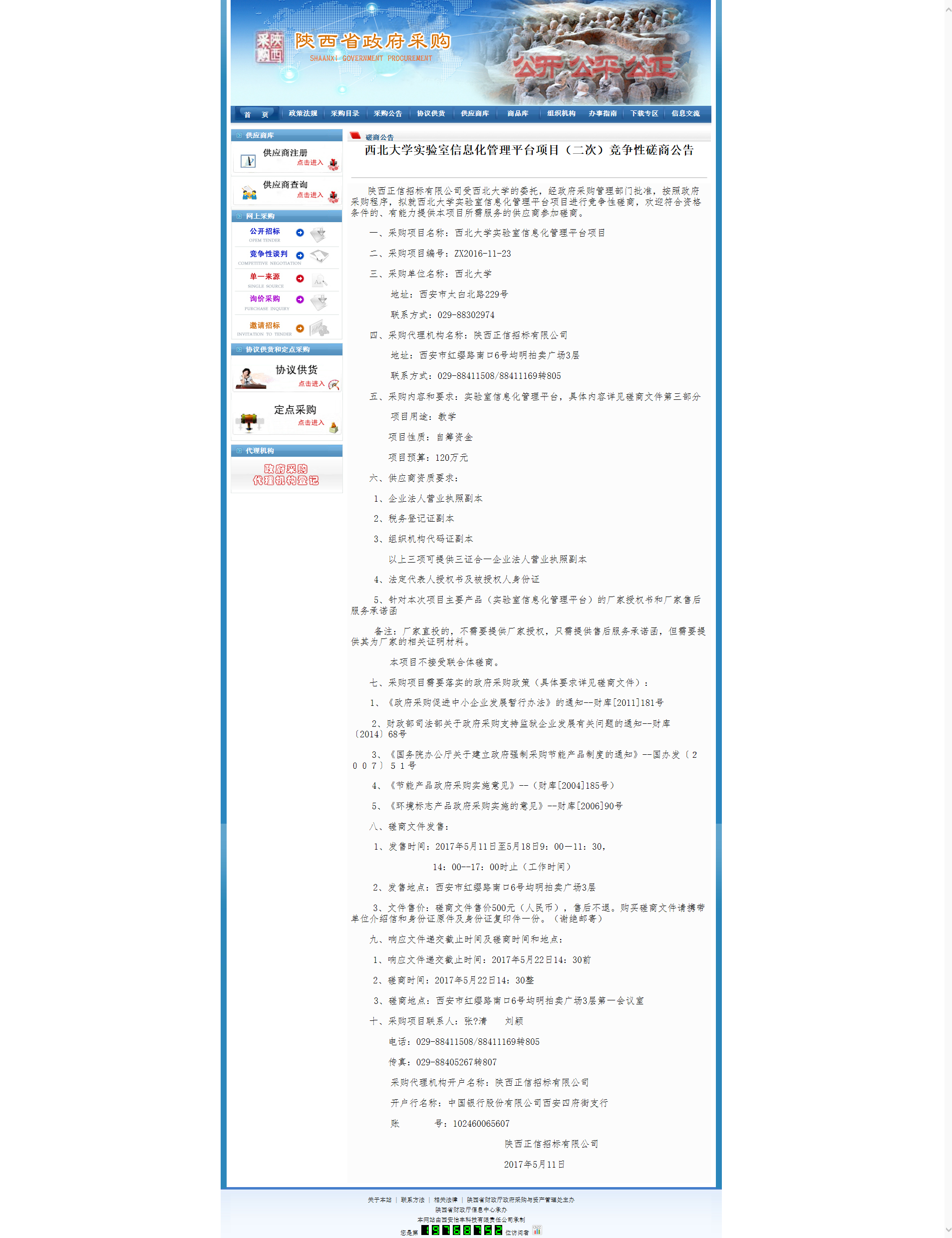 米兰买球实验室信息化管理平台项目(二次)竞争性磋商公告 作者: 编辑: 时间:2017-05-11 16:42 http://www.ccgp-shaanxi.gov.cn/zb_view.jsp?NewsID=ZB170511115300US160408011615&ClassBID=CS001