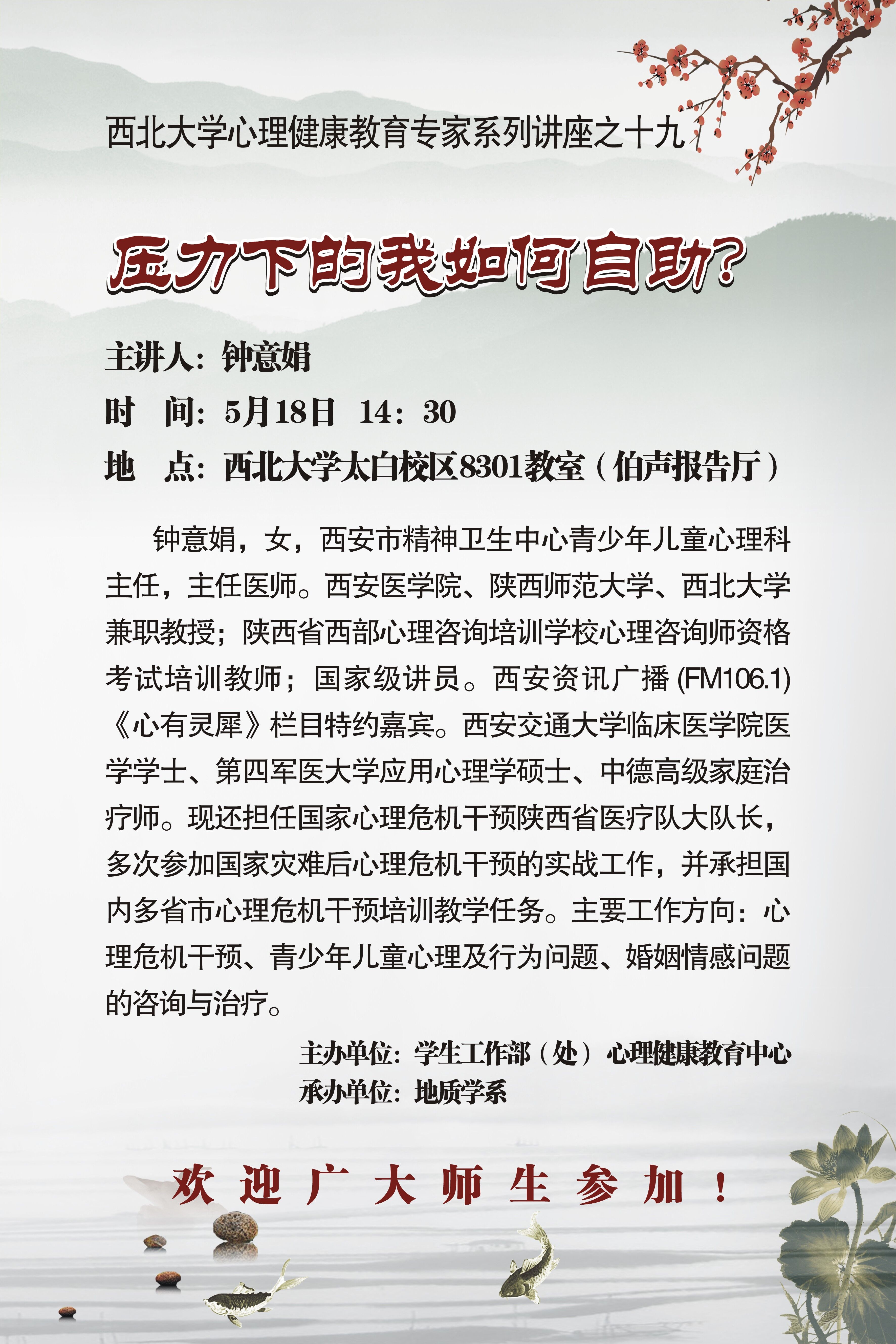 米兰买球心理健康教育专家系列讲座之十九|钟意娟:压力下的我如何自助?