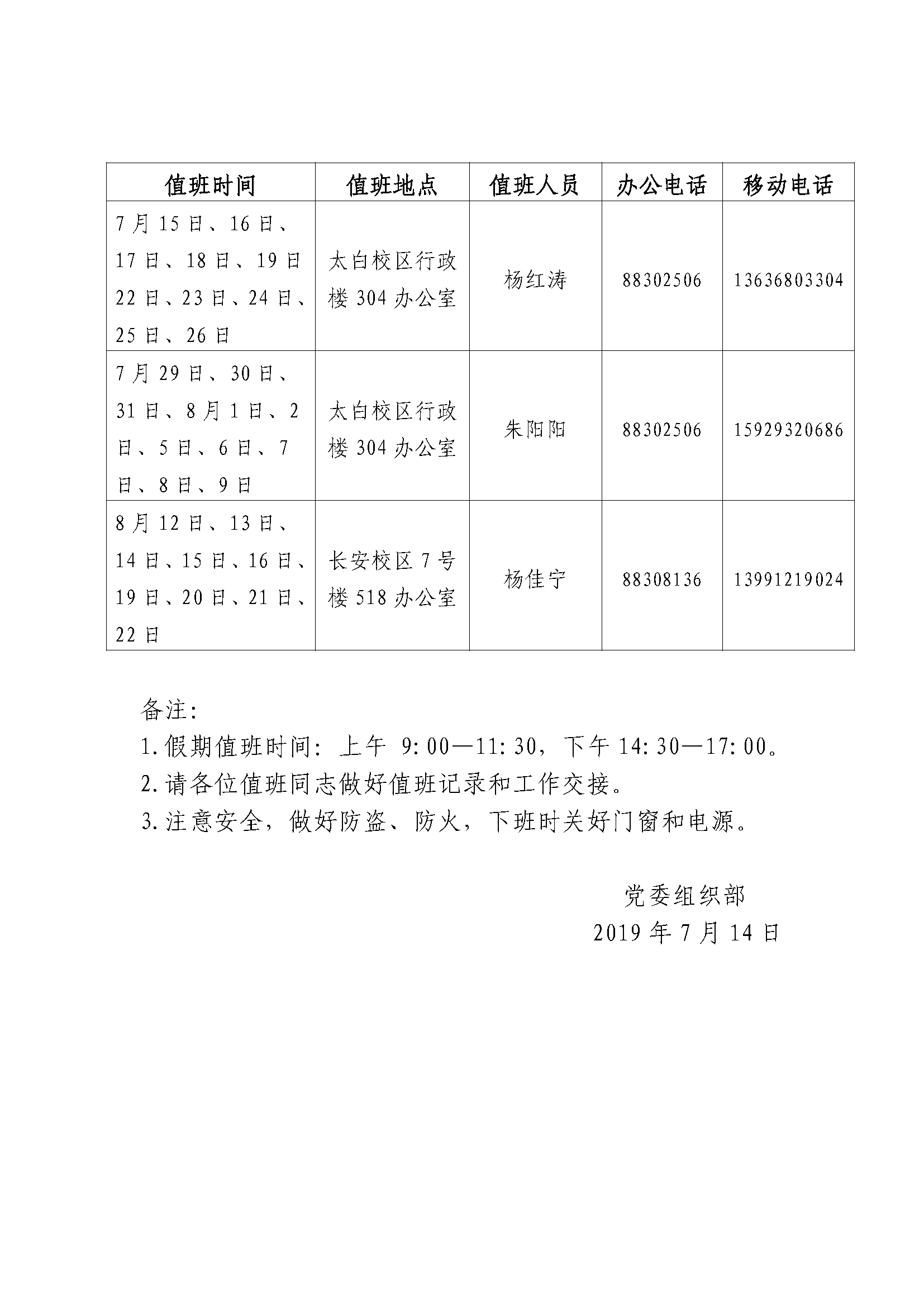 党委组织部2019年暑假值班安排