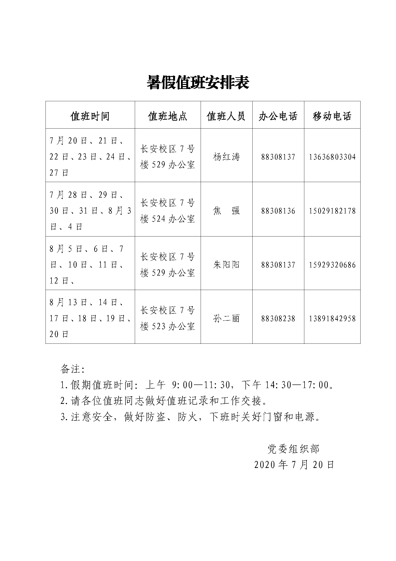 党委组织部2020年暑假值班安排