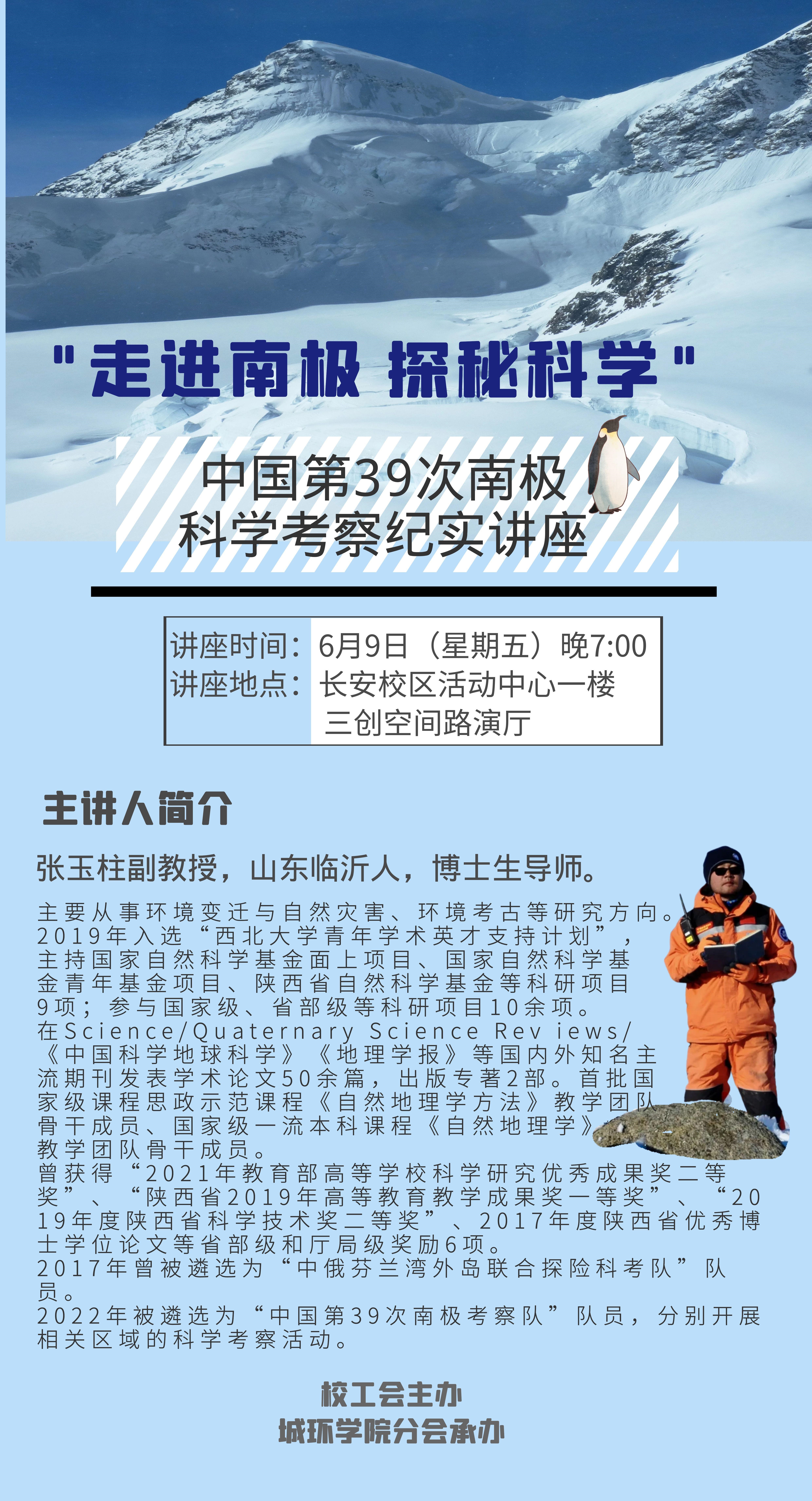 为了培养教职工子女热爱科学、探索科学的兴趣,了解南极,揭开南极科考工作的神秘面纱,校工会将联合城环学院分会开展“走进南极 探秘科学”主题讲座,邀请张玉柱老师分享南极科考工作的经历和见闻。讲座具体安排如下。