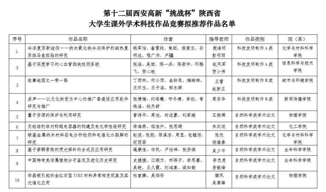 根据团中央《关于组织开展第十六届“挑战杯”全国大学生课外学术科技作品竞赛的通知》(中青联发〔2019〕1号)要求,结合米兰买球实际,校团委拟从米兰买球第九届“挑战杯”大学生课外学术科技作品竞赛优秀作品中遴选推荐《冷冻复苏新途径——纳米氧化铁冷冻保护剂磁热复苏斑马鱼胚胎的研究》等18件作品参加第十二届“挑战杯”陕西省大学生课外学术科技作品竞赛。现予以公示,公示期自2019年4月16日至4月23日。
