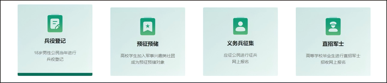 在全国征兵网(http://www.gfbzb.gov.cn)米兰买球(中国),点击“ 兵役登记 ”(注意:还未进行兵役登记的同学,直接从“兵役登记”进入页面;如果已经进行过兵役登记就从“义务兵征集”进入页面。);