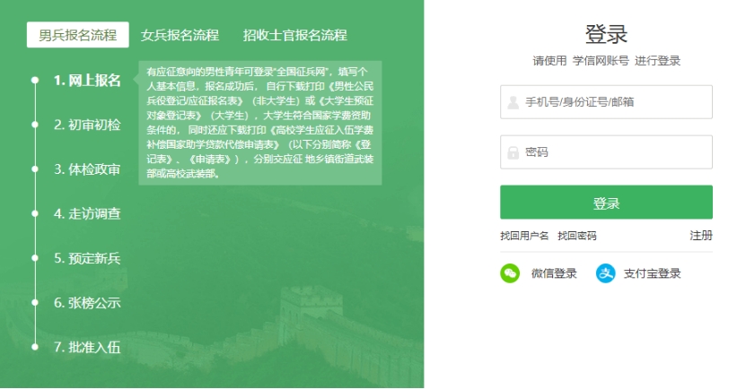 方式一:全国征兵网报名。在全国征兵网上先进行兵役登记后,再按流程进行应征报名(网址:http://www.gfbzb.gov.cn)。