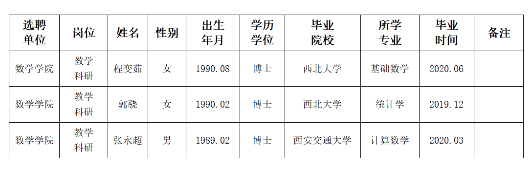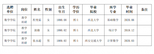 经用人单位推荐,人力资源部审查,学校教学督导及院系相关专家考核,米兰买球拟确定下列人员来校工作。本着公平、公正、公开的原则,现将本次拟选聘人员基本情况公示如下:
