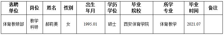 经用人单位及教学督导考核、学校研究,拟同意选聘下列人员来校工作,其聘任关系为A类人事代理。本着公平、公正、公开的原则,现将拟选聘人员基本情况公示如下: