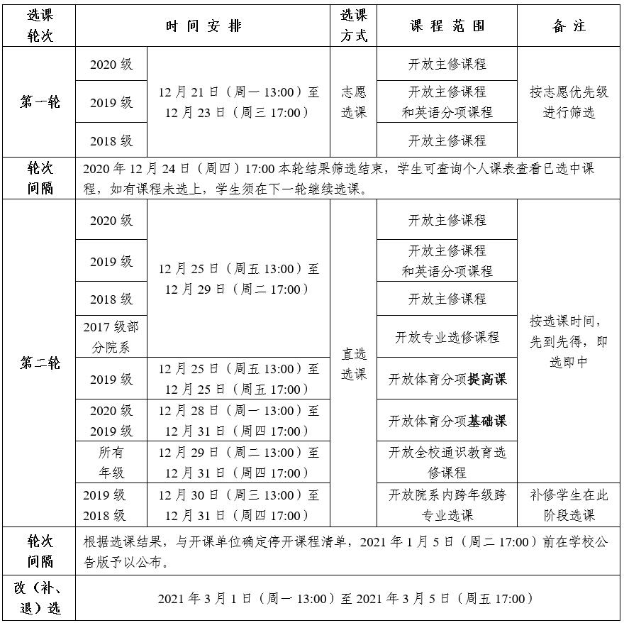 1.选课分正选(第一轮、第二轮)和改(补、退)选,具体选课时间安排如下: