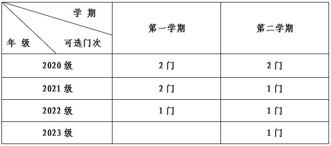 1.根据学校教学计划安排和教学资源设置情况,在选课门次上,一年级新生第一学期暂不修读通识教育选修课程,第二学期每人限选1门、二年级学生每人每学期限选1门、三年级和四年级学生可在上下两学期交错选课1-2门。具体可选课门次如下表所示: