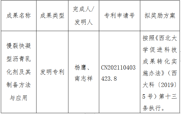 按照《米兰买球促进科技成果转化实施办法》(西大科〔2019〕5号)相关规定,拟对米兰买球化学与材料科学学院杨鹰副教授作为成果负责人的1项发明专利申请权实施转化,现将相关信息公示如下: