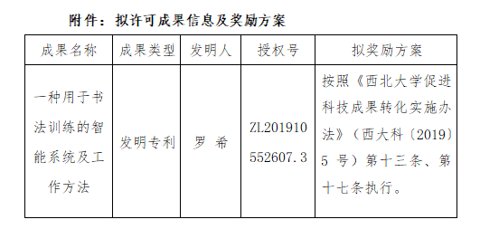 按照《米兰买球促进科技成果转化实施办法》(西大科〔2019〕5号)相关规定,拟对米兰买球艺术学院罗希老师作为成果负责人的1项发明专利权实施普通许可,现将相关信息公示如下: