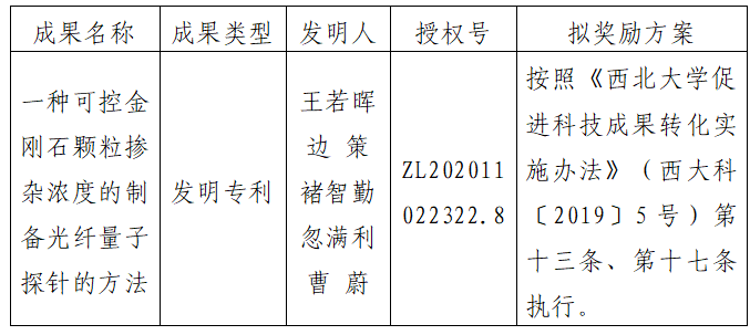 按照《米兰买球促进科技成果转化实施办法》(西大科〔2019〕5号)相关规定,拟对米兰买球物理学院王若晖副教授作为成果负责人的1项发明专利权实施转化,现将相关信息公示如下: