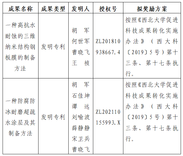 按照《米兰买球促进科技成果转化实施办法》(西大科〔2019〕5号)相关规定,拟对米兰买球化工学院胡军教授作为成果负责人的2项发明专利权实施转化,现将相关信息公示如下:
