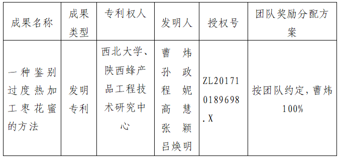 成果负责人与成果受让方自主协议定价,拟转让价格为伍万元人民币。专利权人陕西蜂产品工程技术研究中心授权成果负责人全权负责该专利相关事宜,并承诺放弃本合同中转让价款的收益。